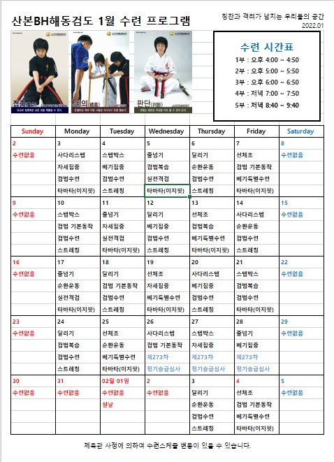 2022년 1월 수련계획표 방학중 수련시간 변경을 원하는 수련생은도장으로 연락 부탁드립니다.